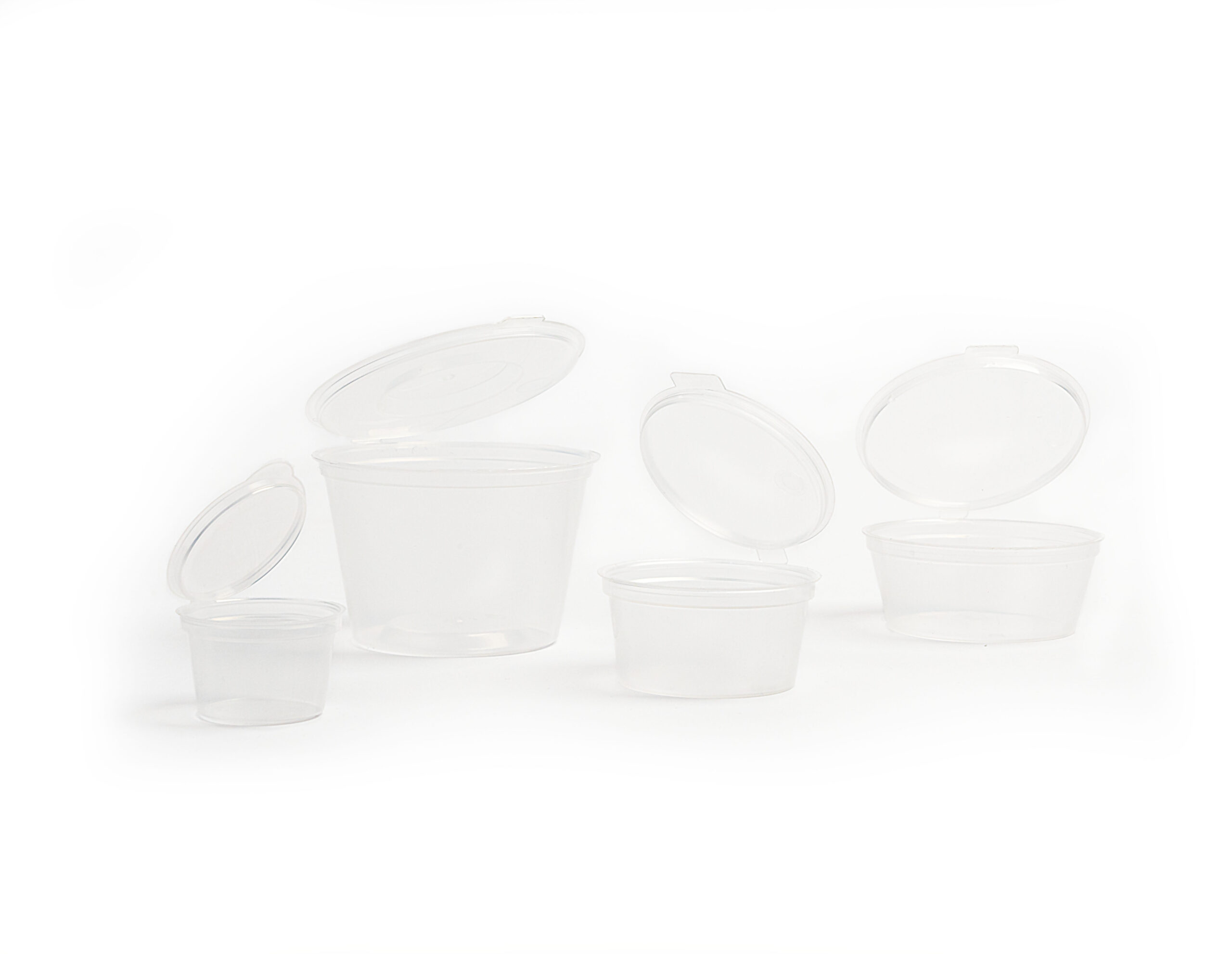 Small and reusable quality sauce cup with an attached hinged lid. Perfect for soy sauce, dressings, or dips.
